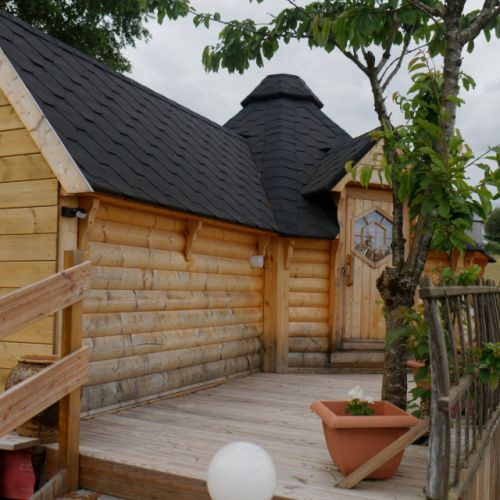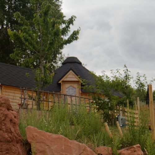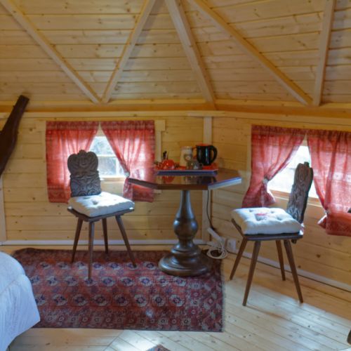 La décoration des chambres a été pensée pour créer une atmosphère bienfaisante avec un aménagement intérieur en contraste avec la construction en bois massif des kotas.
